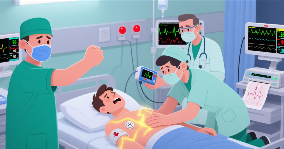 急诊科医护团队立即启动胸痛中心绿色通道,争分夺秒进行抢救。然而,就在完善术前准备、拟紧急转运至导管室进行介入手术的关键时刻,患者心电监护突然发出刺耳的警报:室颤!患者瞬间意识丧失、抽搐,心跳呼吸骤停!