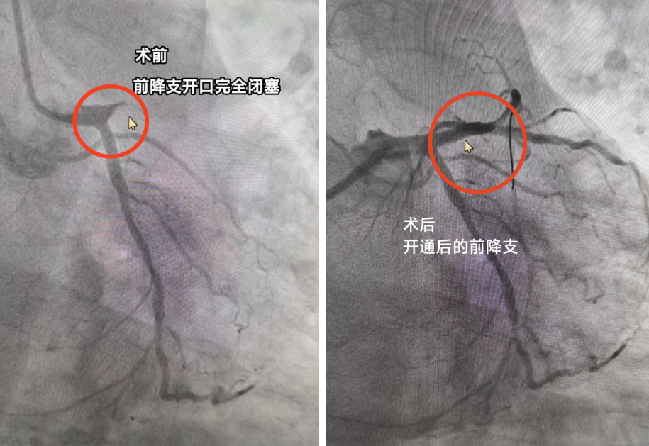 手术组:在患者身体因按压不断晃动的极端困难下,凭借精湛技术和强大心理素质,消毒、穿刺、置管、造影。前降支开口完全闭塞!从穿刺开始到导丝通过病变处仅仅只用了15分钟,导丝成功通过闭塞段后,球囊扩张、血栓抽吸、支架植入等堵塞血管成功开通!血流恢复灌注心肌。患者心律逐渐稳定,血压回升,生命体征转平稳。